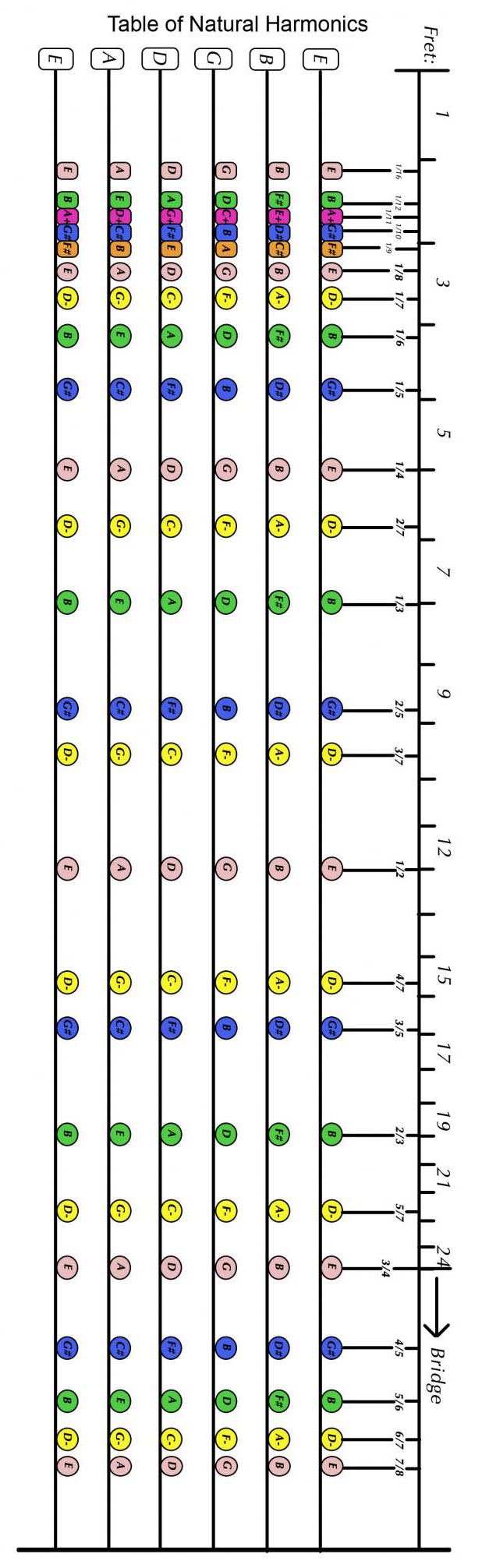 And finally, pay CLOSE attention to how certain harmonics are not at all synced with certain frets on the guitar. That is, some of the harmonics are situated just before or after a fret. This is also the major flaw in the guitar neck that prohibits me from notating anything correctly in guitar software. In the software programs, you can only associate a natural harmonic with a tabbed fret (that is you can’t tab a note that is positioned at ¾ of a fret). So again, pay close attention to the video!