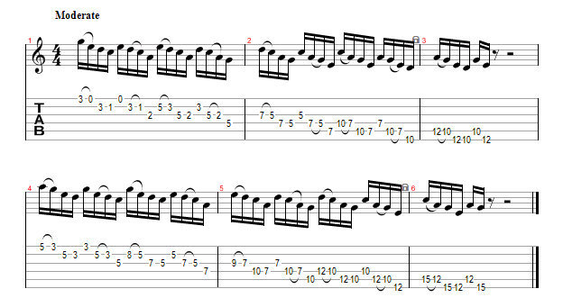 The second exercise is somewhat more advanced. Here we are using a sequential approach. The idea is to fall four notes down in the scale, then going up three notes and falling four again and so on. A VERY well used sequence in almost any type of music. This is also the reason why I have chosen it, because it gives you a somewhat more practical application of the concept. First, let’s look at the sequence locked into one box if you wish to reacquaint yourself with the idea (first position A minor pentatonic).